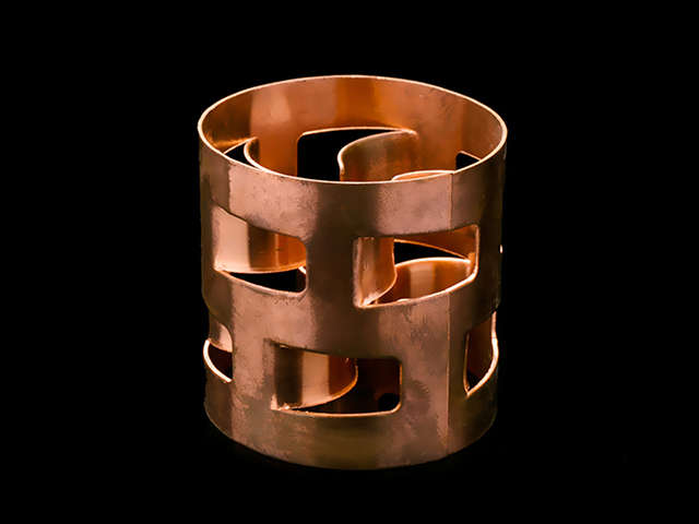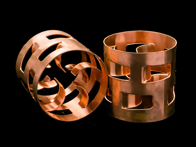 純銅鮑爾環(huán)填料是一種高徑相等的開孔環(huán)型填料,每層窗孔有5個舌葉,每個舌葉內(nèi)彎指向環(huán)心,上下兩層窗孔的位置相反錯開,一般開孔面積約占環(huán)壁總面積的30%左右。具有空隙率大,壓降和傳質(zhì)單元高度低,泛點高、汽液接觸充分、比重小、傳質(zhì)效率高等特點。這種結(jié)構(gòu)改善了汽液分布,充分利用了環(huán)的內(nèi)表面,從而使得填料塔內(nèi)的氣體和液體能夠從窗體自由通過。鮑爾環(huán)填料具有通量大、阻力小、分離效率高及操作彈性大等優(yōu)點,在相同的降壓下,處理量可較拉西環(huán)大50%以上。它采用金屬薄板沖扎制成,在環(huán)壁上開出了兩排帶有內(nèi)伸舌葉的窗孔,每排窗有五個舌葉彎入環(huán)內(nèi),指向環(huán)心,在中心處幾乎相搭,上下兩層窗孔的位置相互錯開,一般開孔的總面積約為整個環(huán)面積的35%左右。由于在環(huán)壁上開了許多窗孔,使得填料層內(nèi)的氣、液分布情況及傳質(zhì)性能比拉西環(huán)有較大的改善。在同樣處理量時,降壓可降低一半,傳質(zhì)效率可提高20%左右。與拉西環(huán)比較,這種填料具有生產(chǎn)能力大、阻力小、操作彈性大等特點,同樣處理時壓降比拉西環(huán)小50%-70%,塔高也有降壓,采用鮑爾環(huán)可以比拉西環(huán)節(jié)約20%-40%填料容積。